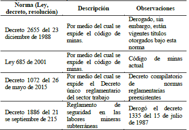 A continuación, en la Tabla 1, se presentan las normas más relevantes para el desarrollo de la minería en Colombia.