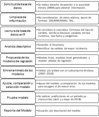 El presente artículo fue desarrollado en tres momentos, el primero de ellos abarco una búsqueda bibliográfica que nos permitiera identificar el marco jurídico para el desarrollo de la minería subterránea en Colombia, específicamente para el ejercicio de labores subterráneas: Código de minas y reglamento de seguridad; así mismo se buscó el reglamento de seguridad en las labores mineras subterránea aplicado en Perú y finalmente se solicitó a la autoridad minera (ANM) una base de datos desde 2005 hasta el 17 de octubre de 2020 de emergencias y fatalidades mineras ocurridas en el país.