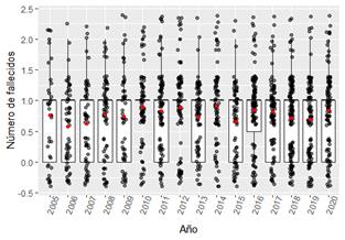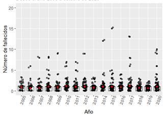 Figura 3: Diagrama de caja de bigotes (boxplots) fatalidades mineras subterráneas ocurridas entre los años 2005-2020.