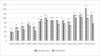 Figura 4: Emergencias y fatalidades mineras subterráneas ocurridas entre los años 2005-2019.