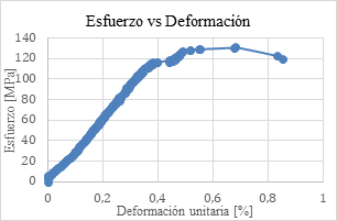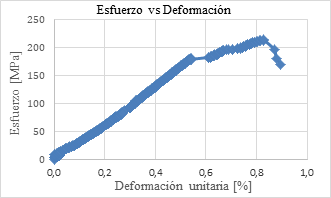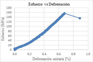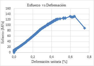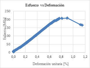 Estas características en la falla, según González de Vallejo et al. (2002), se deben a que durante la carga, la roca se va deformando paulatinamente, generando varios planos de rotura. El módulo de Young obtenido es de 29 GPa.