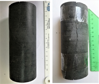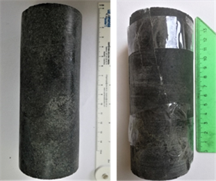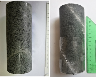 Figura 30: Núcleo de roca intacto y después del ensayo de compresión triaxial.