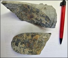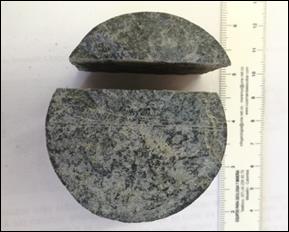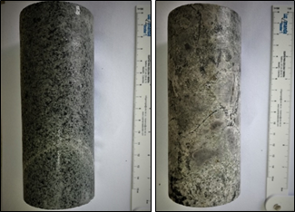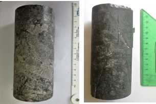 Para el ensayo de carga puntual se obtuvieron dos resultados: el primero comprende fallamiento a través de planos de debilidad creados por la mineralización de sulfuros en forma de venillas paralelas visibles con espesor de hasta 1 mm, y el caso 2 de fallamiento comprende estructuras que no son visibles a simple vista en el núcleo, pero que su geometría está determinada por mineralización de pirita de forma irregular.