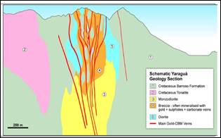El sistema mineralizado de la mina Yaraguá presenta una geología definida por el Complejo Intrusivo de Buriticá (BIC, de la siglas en Inglés de Buriticá Intrusive Complex), que abarca al conjunto de rocas de texturas porfídicas del Mioceno con una composición intermedia conformada por dioritas, andesitas, dacitas, monzodioritas y brechas intrusivas/hidrotermales que se han emplazado en las rocas volcano-sedimentarias de la Formación Barroso y las rocas ígneas plutónicas de la Tonalita de Buriticá (Jones, 2019). En la Fig. 3 se observa un corte vertical donde se aprecia las rocas descritas de la geología regional del sitio. Se presume que estas rocas, de acuerdo con sus características, pueden estar asociadas al cuerpo intrusivo conocido como Andesita de Buriticá datada en 7,44 +/- 0,075 Ma U/Pb en zircón (Correa et al., 2018b)
