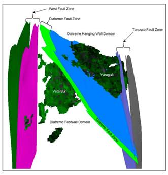 Hay tres dominios asociados a la zona de diatrema: el primero se conoce como zona de falla, cuyas rocas son de baja calidad geomecánica y una resistencia a compresión uniaxial (UCS) de 50 MPa; el segundo dominio es el bloque techo de diatrema, sus rocas de buena calidad con una resistencia a compresión uniaxial de 98 MPa; y el tercer dominio es el bloque piso, donde las rocas tienen buena calidad y una UCS de 90 MPa.