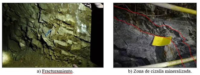 El primer mapeo se hizo por celdas cuadradas de un metro de lado para poder calcular directamente el índice volumétrico de diaclasas y estimar el Índice de calidad de la Rocas - RQD - (de la sigla en inglés Rock Quality Designation). En las secciones del túnel, la roca tiene alto grado de fracturamiento con varias familias de diaclasas que forman bloques casi cúbicos de entre 50 cm a 60 cm de lado. También se observó la influencia de zonas de cizalla en el macizo rocoso con brecha de falla o vetas alteradas mineralizadas (Fig. 6).