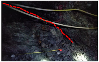 El mapeo por línea de detalle consiste en registrar las discontinuidades expuestas en la roca a lo largo de una longitud determinada. Para este estudio se hicieron líneas de 7 m a 8 m de longitud. Se registraron algunas familias de diaclasas y fallas locales con brecha de falla (Fig. 7). Se observó que varios sitios mapeados ya presentaban sostenimiento con pernos tipo split set y malla electrosoldada en las paredes y en el techo de la excavación.