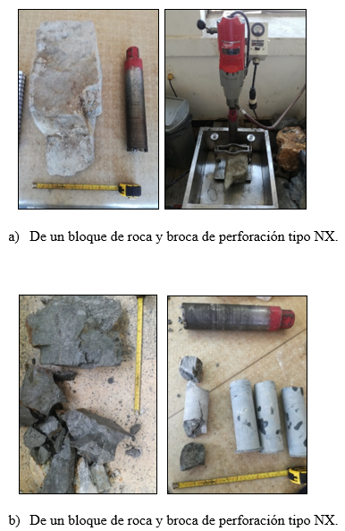 Para realizar los ensayos de compresión triaxial, carga puntual y velocidad de ondas se procedió a obtuvieron siete núcleos con diámetro de 54 mm y una longitud de 130 mm utilizando una broca de perforación tipo NX (Fig. 8a). Durante la obtención de los núcleos no se tuvo en cuenta ninguna dirección preferencial asociada a venas, fracturas o alguna discontinuidad presente. Algunos bloques de roca con fracturamiento interno no resistieron la rotación de la broca y se rompieron por sus planos de debilidad en unos casos, y se fragmentó el núcleo, en otros.