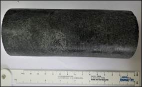 Rotura. En términos generales el núcleo presenta un grado medio fracturamiento, donde la rotura se da por un plano en diagonal y aleatorio (Fig. 30); en la superficie de falla presenta mineralización en pirita diseminada y carbonatos. En la base del núcleo se desarrollaron dos fracturas semicirculares.