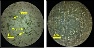 Rotura. El núcleo presenta alto grado de fracturamiento. La falla se da en un plano en diagonal que corta la mineralización semiparalela al eje principal del núcleo (Fig. 31). También se encontraron fisuras desarrolladas en los extremos del núcleo. Su fractura se da en forma astillosa siguiendo venillas mineralizadas de menor longitud. El plano de falla presenta mineralización de carbonatos diseminados con algunos cristales de magnetita y pirita levemente alterados.