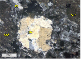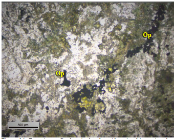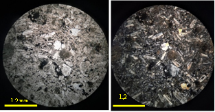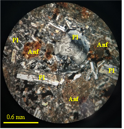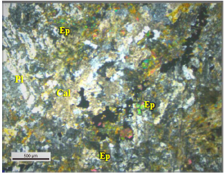 Durante la caracterización petrográfica se encontró una variación litológica entre rocas basálticas de color verdoso, andesita, dioritas y una especie de brecha. En sección delgada se encontró que la coloración verde en las rocas se debe a un alto grado de alteración de los minerales principales como la plagioclasa y anfíboles, los cuales se encuentran zonificados, con algunos bordes irregulares y con reemplazamiento total o parcial por clorita, epidota y carbonatos.