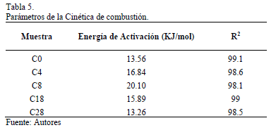 Los parámetros cinéticos obtenidos de la combustión se enumeran en la Tabla 5.