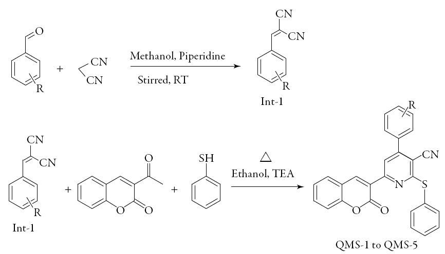Equimolar mixture of 2-benzylidenemalanonitrile derivatives (Int-1), 3-acetylcouma-rin and thiophenol (Sigma Aldrich & CAS No.- 108-98-5) in ethanol was refluxed in presence of tri ethylamine (TEA) (Sigma Aldrich & CAS No.- 121-44-8) used as a catalyst. The progress of reaction was checked by TLC using (0.9: 0.1 v/v-chloroform: methanol) as a mobile phase. After completion of reaction, the temperature of reaction mass was allowed to decrease up to room temperature. The obtained solid was separated by filtration, washed with cold methanol and dried.