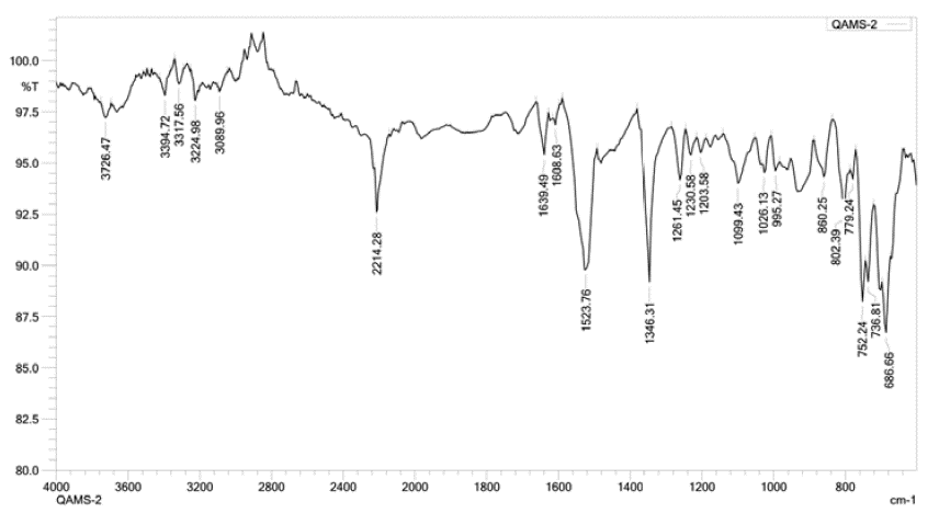The IR spectrum of QMS-1 is given in Figure 2. The peaks observed around 32003500 cm-1 are due to stretching of -OH (H-bounded) and/or -NH- groups. The peak around 2929-2978 cm-1 is of -CH stretching of aromatic ring. The-CN stretching is observed around 2300-2200 cm-1. The peaks for -C=O and C-H stretching are obtained around 1600-1700 cm-1 and 1550-1600 cm-1 respectively whereas alkane C-H bending peak is observed around 1469-1490 cm-1. The peaks observed around 1300-1334 cm-1 are due to C-O stretching of ester group and/or ether group. The -CN stretching is observed around 1250-1050 cm-1.