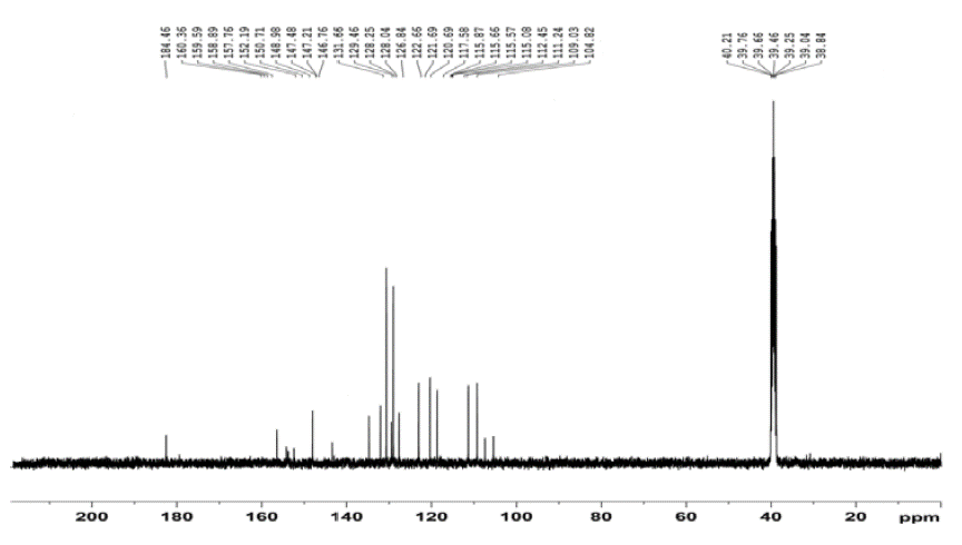 13 CNMR (DMSO-d 6 , 400 MHz) (δppm): 104.58, 109.39, 113.68, 112.29, 115.89, 115.37, 115.69, 127.39, 120.97, 121.58, 122.69, 126.38, 127.36, 128.79, 129.90, 136.78, 146.36, 147.48, 147.68, 148.12, 150.45, 153.78, 157.90, 158.23, 159.56, 160.78, 185.12.