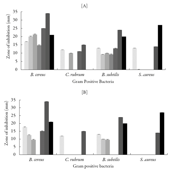 Figure 6: Antibacterial activity of synthesized compounds against Gram positive bacteria in [A] DMF and [B] DMSO. [QMS-1, (); QMS-2, (); QMS-3, (); QMS-4, (); QMS-5, (); Chloram-phenicol (); Tetracyclin ()].