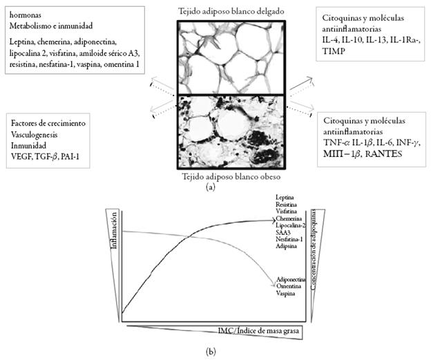 La desregulación de la producción de citoquinas en los ratones deficientes en leptina conduce a una mayor susceptibilidad a las infecciones y estímulos inflamatorios. Recientemente, la leptina se describió como un nuevo regulador del crecimiento óseo que actúa, o bien a través de una red neuronal para liberar un factor antiosteogénico no identificado, o bien directamente induciendo la proliferación de osteoblastos, síntesis de colágeno y mineralización ósea. La leptina es también un factor de crecimiento del esqueleto que estimula la osificación endocondral. Debido a que se ha demostrado que el receptor de leptina funcional o la isoforma larga OB-Rb está expresado en el cartílago humano normal, se puede afirmar que la leptina puede también actuar sobre este tejido conectivo articular, especialmente durante la osteoartritis (OA), una enfermedad en la cual se han observado grandes cambios metabólicos de los condrocitos [36]. En aquellas personas con OA también se encontró leptina en el líquido sinovial. Su cantidad indicó una correlación con el IMC. La leptina se encontró también en los cartílagos y en las espuelas óseas u osteofitos [37]. A continuación, se indican las diferentes respuestas endocrinas, metabólicas y de regulación inmune que presentan las diferentes adipoquinas, especialmente la leptina en el tejido adiposo blanco (véase la figura 9).