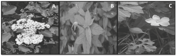 Figure 1: Photographs of plants: A. Cordia dentata Poir, B. Heliotropium indicum Linn, C. Momordica charanatia Linn.