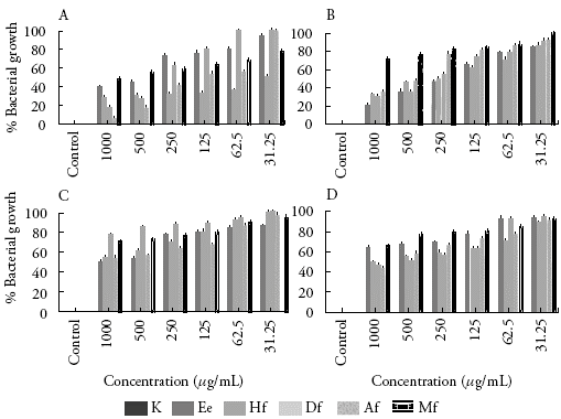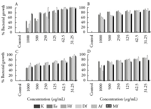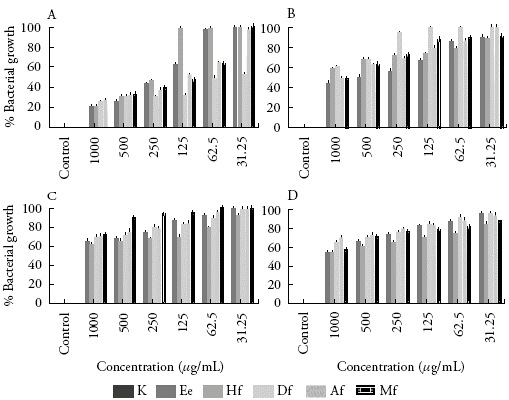 Figure 2: Antibacterial activity, MIC (μg/mL) and MBC (μg/mL) of the ethanol extract and fractions of C. dendata P. Strains: (A) S. aureus; (B) S. epidermidis; (C) P. aeruginosa; (D) K. pneumoniae. Kanamycin (K); Ethanol extract (Ec); Hexane fraction (Hf ); Dichloromethane fraction (Df ); Ethyl acetate fraction (Af ); Methanol fraction (Mf ).