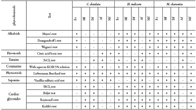 Table 1: Phytoconstituents of the extract and fractions of C. dendata Poir, H. indicum Linn and M. charantia Linn.