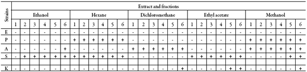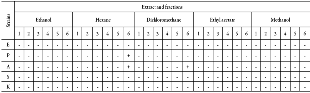 Strains: Escherichia coli (E); Pseudomonas aeruginosa (P); Staphylococcus aureus (A); Staphylococcus epidermidis (S); Klebsiella pneumoniae (K). Concentrations: 1 = 31.25 μg/mL; 2 = 62.5 µg/mL; 3 = 125 µg /mL; 4 = 250 µg /mL; 5 = 500 µg/mL; 6 = 1000 µg /mL Inhibition zone = < 6 mm no antibacterial activity (-); Inhibition zone = > 6 mm: high antibacterial activity (+).
