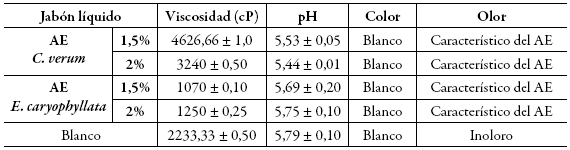 En el análisis reológico se registró un comportamiento característico de los jabones líquidos en todos, obteniendo valores comprendidos entre 1070 y 4626,66 cP, y se observó que el AE de clavo genera valores de viscosidad más bajos en el jabón líquido. Además, se determinó que las formulaciones corresponden a un fluido no newtoniano con tixotropía positiva. Las propiedades reológicas deben proporcionar al preparado una adecuada extensibilidad y adaptabilidad a la superficie y cavidades cutáneas 14,33,34.