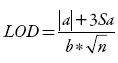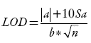 Donde: Sα = desviación estándar del intercepto a bajas concentraciones, α = intercepto a bajas concentraciones y b = pendiente de la curva de calibración a altas concentraciones.