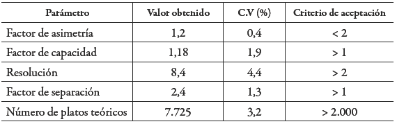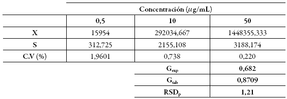 La precisión se determinó mediante la evaluación de la repetibilidad (intradía) y de la precisión intermedia (interdías). El ensayo intradía se estimó mediante análisis por triplicado de tres niveles de concentración (0,5, 10 y 50 µg/mL) en el mismo día, con el mismo analista y con el mismo equipo. Se evaluó a través del coeficiente de variación promedio ponderado (RSDp), obtenido a partir del test de Cochran, y el valor de aceptación para el método en cada nivel debe ser C.V ≤ 15% 18; mientras que el criterio de aceptación, al evaluar la repetibilidad del sistema, es que el coeficiente de variación de las medidas sea máximo del 1% 19. La precisión intermedia se valoró en tres días y con dos analistas, utilizando los tres niveles de concentración del analito (0,5, 10 y 50 µg/mL) y se evaluó mediante un ANOVA empleando una confianza del 95%.
