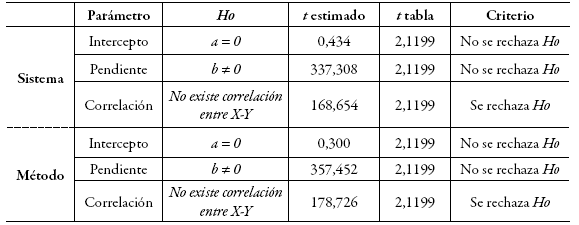 Por otra parte, se hicieron pruebas de hipótesis para el intercepto, la pendiente y el coeficiente de correlación de las curvas de calibración, mediante el estadístico t de Student (tabla 2).