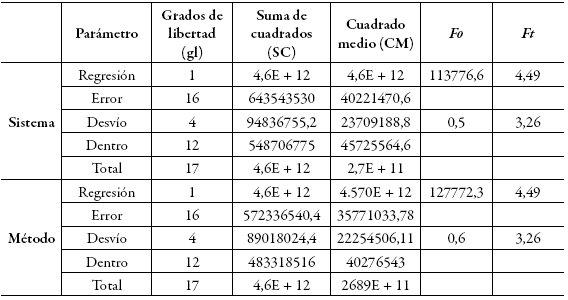 Tabla 3: ANOVA de la regresión lineal para el sistema y para el método, prueba de F.