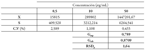 Para evaluar la precisión intradía, se tomaron muestras preparadas por triplicado a tres niveles de concentración (0,5, 10 y 50 µg/mL), y se empleó el test Cochran. Tal como se evidencia en las tablas 4 y 5, para cada uno de los casos se observó un valor de Gexp menor al Gtab, lo cual indica que las varianzas no son estadísticamente diferentes entre sí; es decir, las varianzas de las concentraciones son homogéneas e indican que el factor concentración no influye en la dispersión de los resultados 19.
