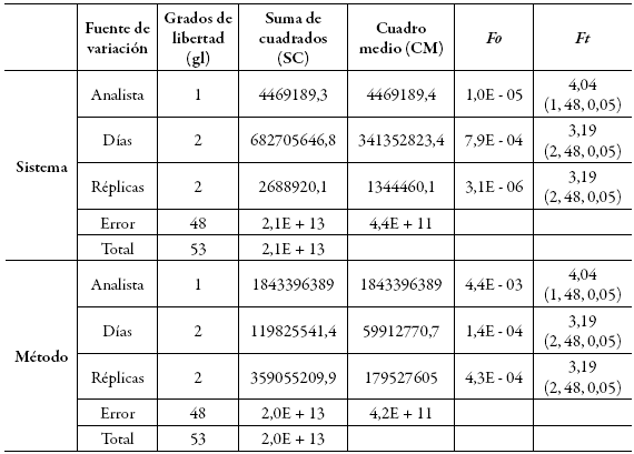 Tabla 6: . Precisión intermedia y análisis de varianza del sistema y del método.