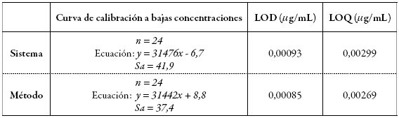 Los límites de cuantificación y detección se calcularon utilizando las curvas de calibración para sistema y método y unas segundas curvas de concentraciones bajas, a las cuales se les comprobó la linealidad, precisión y exactitud. Los resultados obtenidos se consignan en la tabla 7, y se utilizaron para calcular tanto el límite de detección como el límite de cuantificación, cuyos valores fueron de 0,93 y 0,85 ng/mL para el límite de detección en el sistema y método; y de 2,99 y 2,69 ng/mL para el límite de cuantificación del sistema y método, respectivamente.