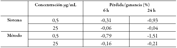 Por medio de la comparación de las pendientes de las curvas de calibración del sistema y del método, se evaluó todo el rango lineal, obteniendo 99,9% de porcentaje de recuperación; por lo cual, se estableció que la exactitud del método es correcta.