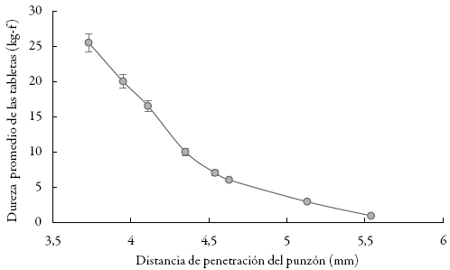 Figura 1: Dureza de las tabletas en función de la distancia de penetración del punzón.
