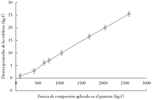 Se encontró una relación directa entre la fuerza de compresión aplicada en el punzón y la dureza promedio obtenida en las tabletas (figura 2). Este comportamiento facilita el control del proceso, ya que, al existir dicha proporcionalidad entre fuerza y dureza, la tableteadora puede garantizar la reproducibilidad de los resultados en el proceso de compresión 12,17.