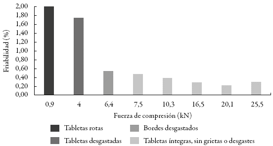 En la figura 4 se reportan los resultados obtenidos al evaluar la friabilidad de las tabletas obtenidas a los diferentes niveles de fuerza de compresión investigados.