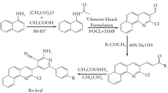 An equimolar mixture of 1-naphthyl amine and acetic anhydride in methanol was refluxed in water bath for 2-3 hrs using CH3COOH as catalyst. The crude product formed was N-(naphthalen-1-yl) acetamide which was isolated and crystallized from absolute ethanol. This synthesized product was added in a mixture of Vilsmeier-Haack reagent (prepared by drop wise addition of 6.5 ml POCl3 in ice cooled 2 ml DMF) and was refluxed for 27 hrs. The reaction mixture was poured into ice and kept for overnight followed by neutralization using sodium bicarbonate. The crude product was isolated and crystallized from ethanol. The product was 2-chloro benzo[h]quinoline-3-carbaldehyde.