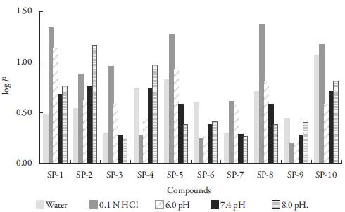In 7.4 pH range, among all these compounds SP-7 has minimum log P values máximum is observed for SP-4 which can be considered more hydrophobic in nature. The decreasing order of hydrophobicity of compounds is:
