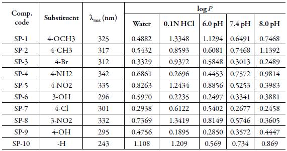 At 6.0 pH, SP-1 with methoxyl group at para-position to aromatic ring is highly hydrophobic in nature. While SP-6 is more hydrophilic which contains hydroxyl group at meta-position. Overall the decreasing order of hydrophobicity of compounds is: SP-1 > SP-5 > SP-8 > SP-2 > SP-3 > SP-10 > SP-7 > SP-4 > SP-9 > SP-6.