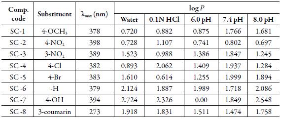 In 7.4 pH range, among all these compounds SC-2 has minimum log P values whereas maximum is observed for SC-5 which can be considered more hydrophobic in nature. The decreasing order of hydrophobicity of compounds is: SC-5 > SC-4 > SC-7 > SC-3 > SC-1 > SC-6 > SC-8 > SC-2.