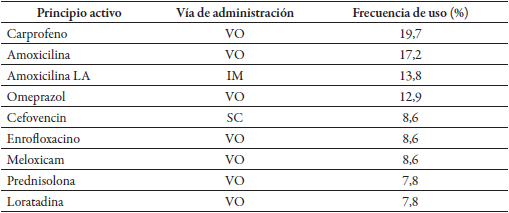 Tabla 1: Principios activos prescritos y vía de administración, en clínicas veterinarias de Heredia, Costa Rica.