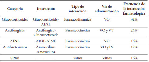 En 25 pacientes se detectaron interacciones (21,6%); de estas, las principales categorías farmacológicas en las que se presentaron se enumeran en la tabla 2, siendo el grupo de los AINE el que se relacionó con mayor cantidad de interacciones, ya que se encontra ron terapias que combinaban distintos AINE, o los AINE con glucocorticoides.