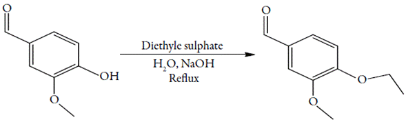 An aqueous solution of vanillin was refluxed at 95-97°C for half an hour with stirring. To this solution, few drops of NaOH and diethyl sulphate were added slowly and again the reaction mixture was refluxed for 5 to 7 hrs with stirring. After the completion of reaction, organic layer was isolated and cooled at room temperature. The solid crude product (3-methoxy4-ethoxybenzaldehyde) was isolated and crystallized from absolute ethanol.