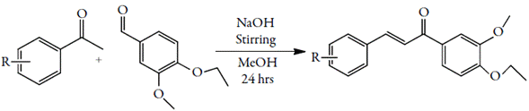 A mixture of above synthesized product 3-methoxy4-ethoxy benzaldehyde and substituted acetophenone in methanol was stirred for 24 h in presence of few drops of sodium hydroxide solution. The product was filtered and dried. The recrystallization was done in ethanol.