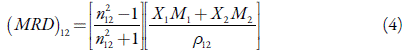 where n12 and p12 are refractive index and density of solution respectively. X1 and X2 are the mole fractions and M 1 and M 2 are the molecular weight of the solvent and solute respectively.