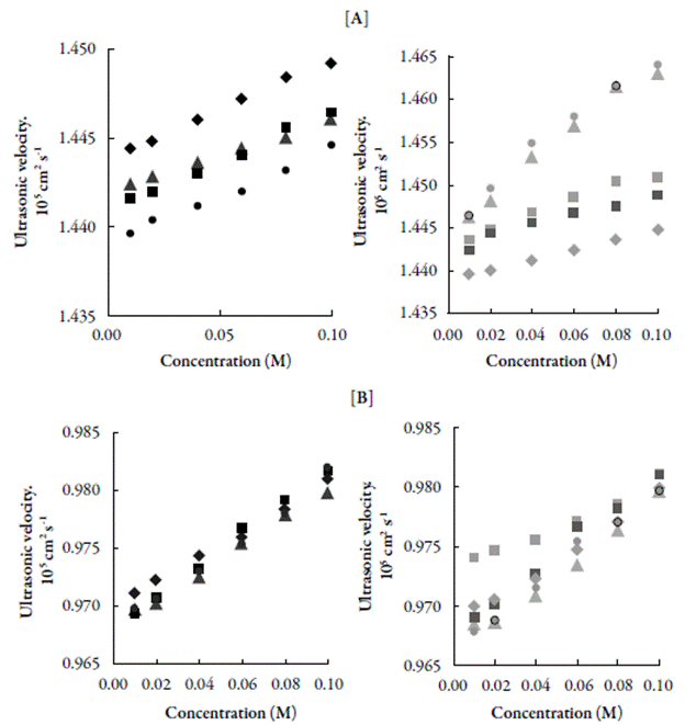 Figure: 1. The variation of ultrasonic velocity with concentration for compounds in [A] DMF and [B] Chloroform at 303.15 K. ♦: C-1. ■: C-2. ▲ : C-3. ●·: C-4 ♦: C-5. ■: C-6. ▲ : C-7. ·●: C-8. ■: C-9.