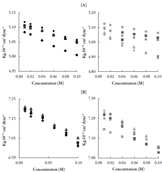 The decrease of intermolecular free length with increase of concentration suggests that the distance between solute and solvent molecules decrease due to increase in solute-solvent interactions, which causes velocity to increase. This is supported by isentropic compressibility (к s ) and relaxation strength (r). Figure 2 shows the variation of isentropic compressibility (k s ) with increase in concentration.