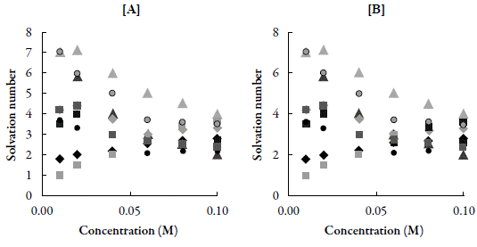 The type of interactions between solute and solvent molecules can also be suggested by solvation number (S n ), which gives the information about structure forming tendency or structure breaking tendency of a compound in solutions. Figure 3 shows variation of solvation number of compounds with concentration in both the solvents.