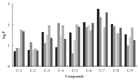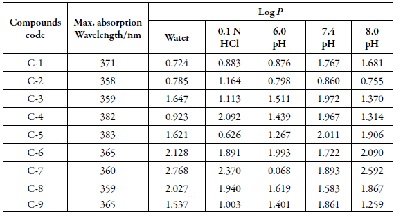 Partition coefficient: The log P values for the studied compounds at different pH are given in Table 9. The log P value depends upon the hydrophilic and hydrophobic character of compounds and has inverse relation with hydrophilicity of compounds.